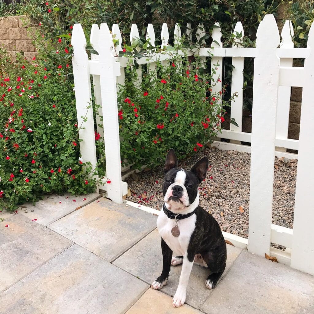 This setup uses a white vinyl picket fence with a gate frame to section off a dedicated potty corner. The ground is lined with pea gravel and river rock — about 2–3 inches deep — so urine drains through instead of pooling. Tucked against a stone wall with red salvia bushes framing both sides, it looks like a Pinterest garden nook. Not a dog bathroom. That’s the whole point.