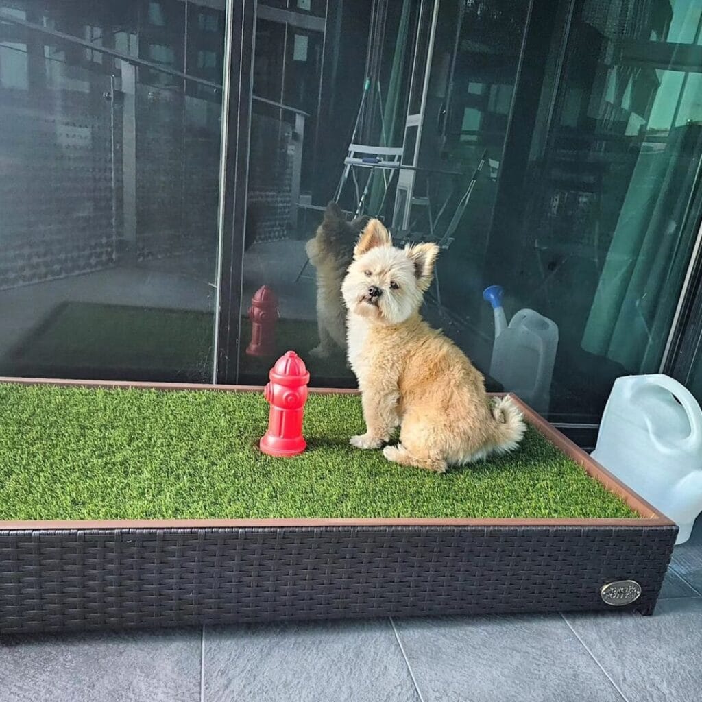This one caught my eye on Instagram and I genuinely gasped. It’s a raised wicker-panel potty box filled with artificial turf, with a red plastic fire hydrant marker right in the center as a scent anchor for training. The whole thing sits against a glass wall — clean, contained, and honestly Pinterest-worthy.