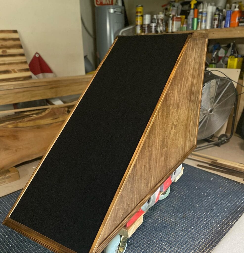 This ramp is built from ¾-inch plywood side panels stained in warm walnut, with pine trim framing the edges. The surface? Black carpet runner glued right onto the incline. And the base rolls on swivel caster wheels so you can move it room to room.
