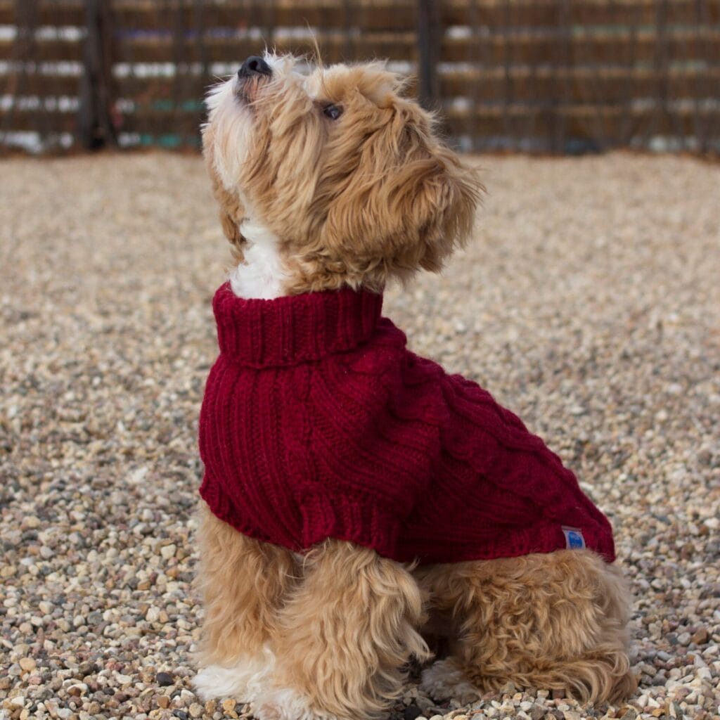 This cable-knit burgundy creates cozy cabin vibes that look intentional on your mudroom hooks between walks. Max wore his for 25+ wears before needing edge touch-ups with fabric glue. It keeps dogs comfortable in 35-45°F weather without overheating during your 20-minute neighborhood loop, which means you’ll skip those guilty “too cold for walkies” mornings. The soft knit texture sits gently against fur—no scratching or trying to wiggle free.