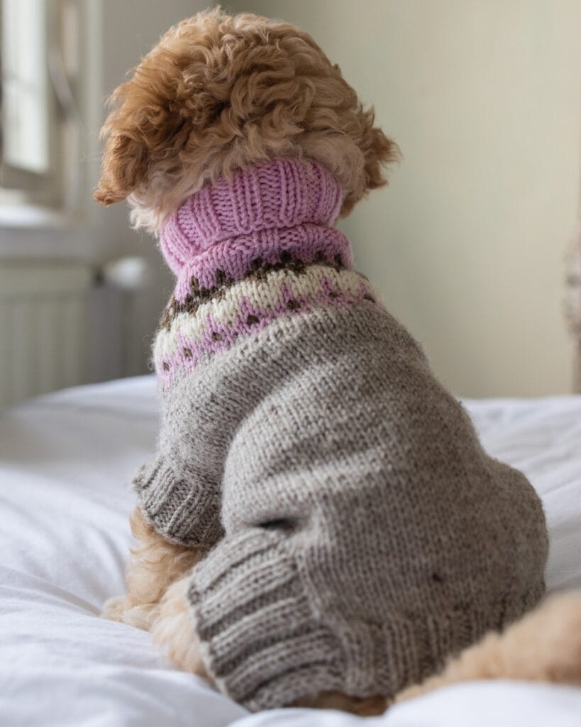 The beige-and-lavender Fair Isle pattern matches minimalist Scandinavian decor without screaming “dog stuff.” Machine wash cold, air dry flat—Charlie’s version survived 25 washes before the cuff stretched. Don’t cut leg holes bigger than your thumb width or they’ll gap awkwardly around skinny legs.