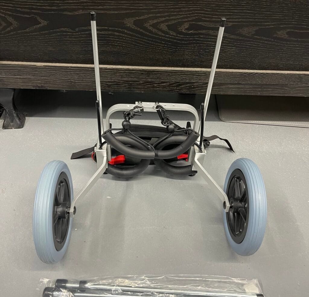 Adjust the frame height so your dog’s spine stays level — not tilted up or down. A tilted spine puts pressure on the front joints fast and causes fatigue. If your dog pulls the leash hard to one side at first, that’s normal. They’re figuring out the new center of gravity. Give them a week.