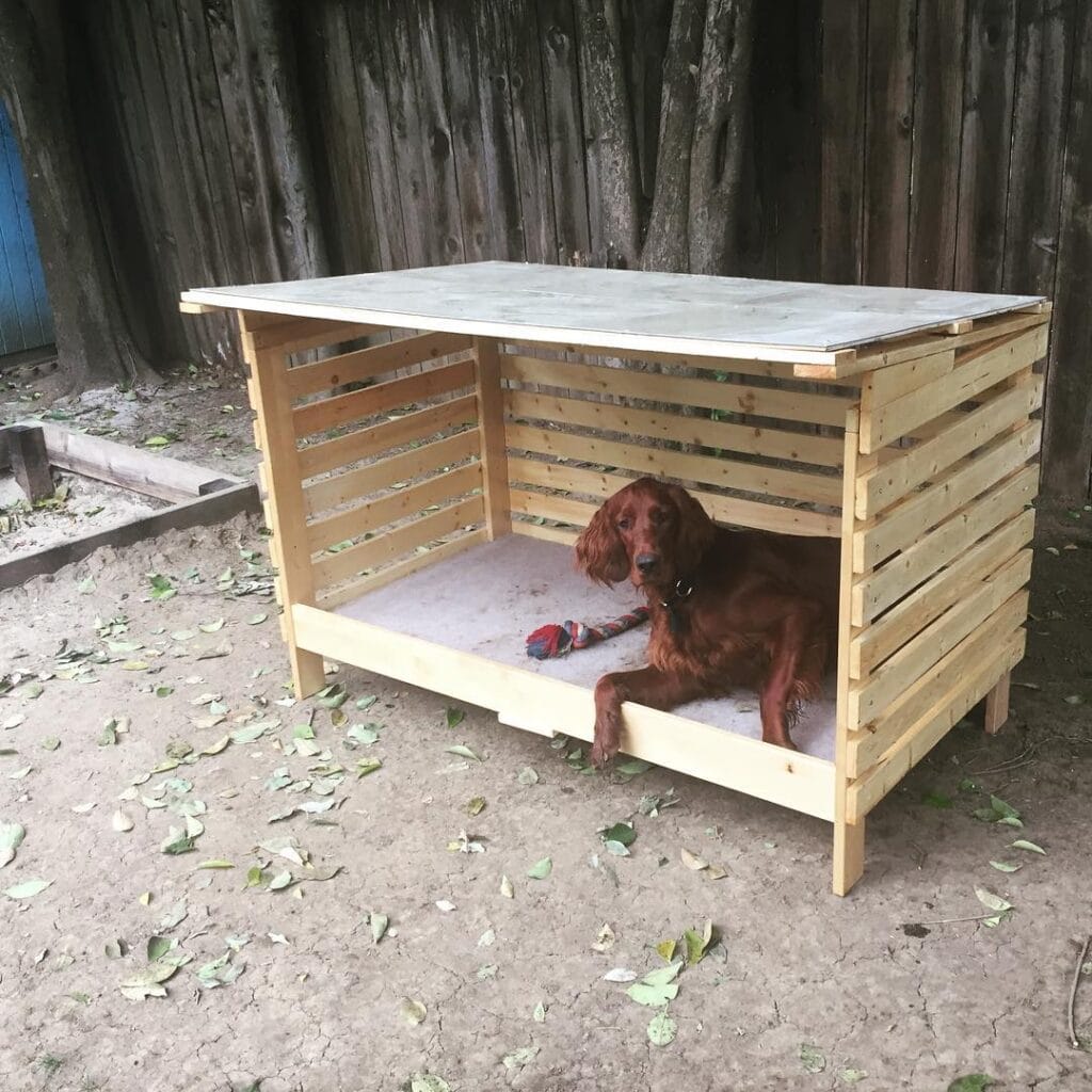 A simple wooden pallet-style structure can create a surprisingly cozy space for dogs that enjoy relaxing outdoors. This type of design offers ventilation while still providing shade and protection from light rain.
