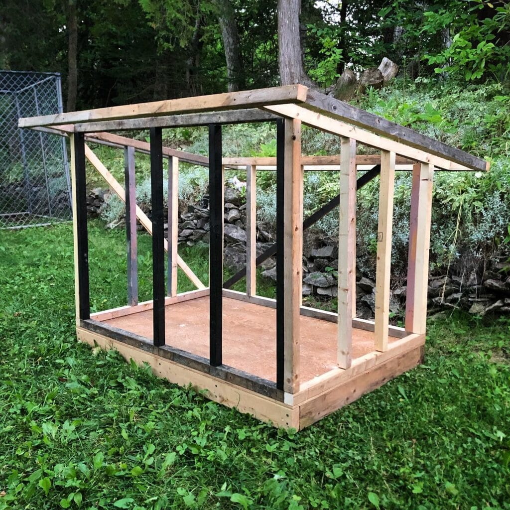 The image shows a sturdy wooden frame with vertical beams and a slanted roof frame, ready to be enclosed with siding panels.