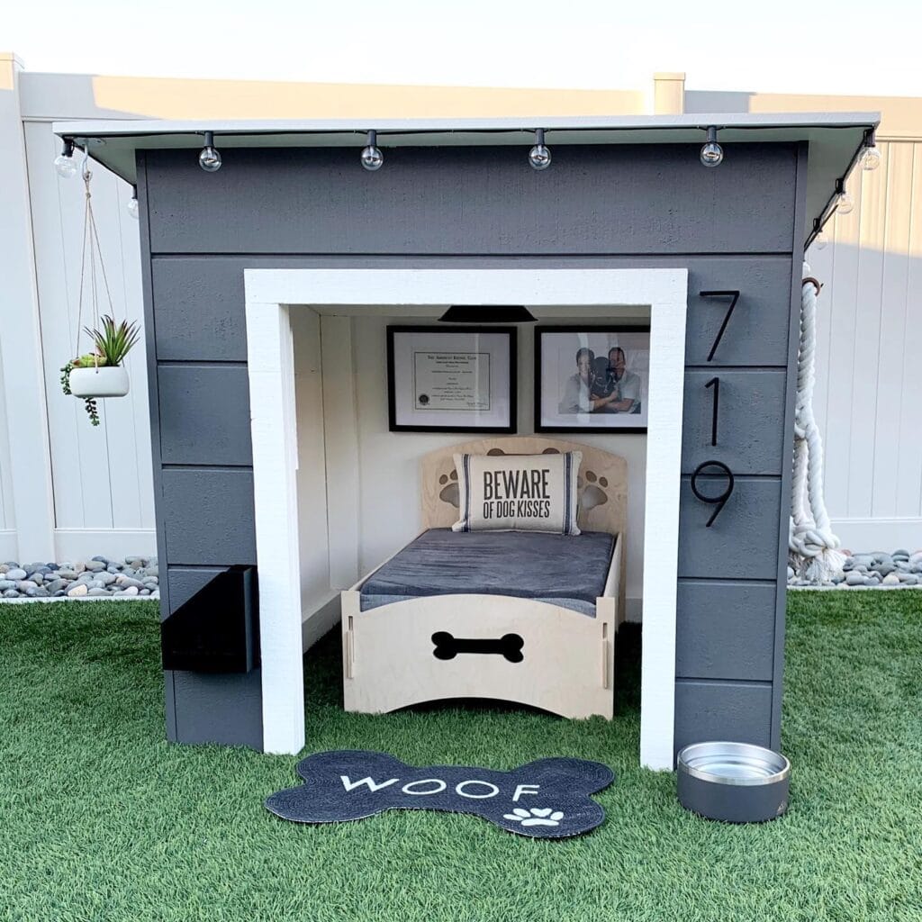 Sometimes a dog house can be more than just shelter—it can also be stylish. This modern dog house design resembles a small human bedroom, complete with a bed and decorative interior.