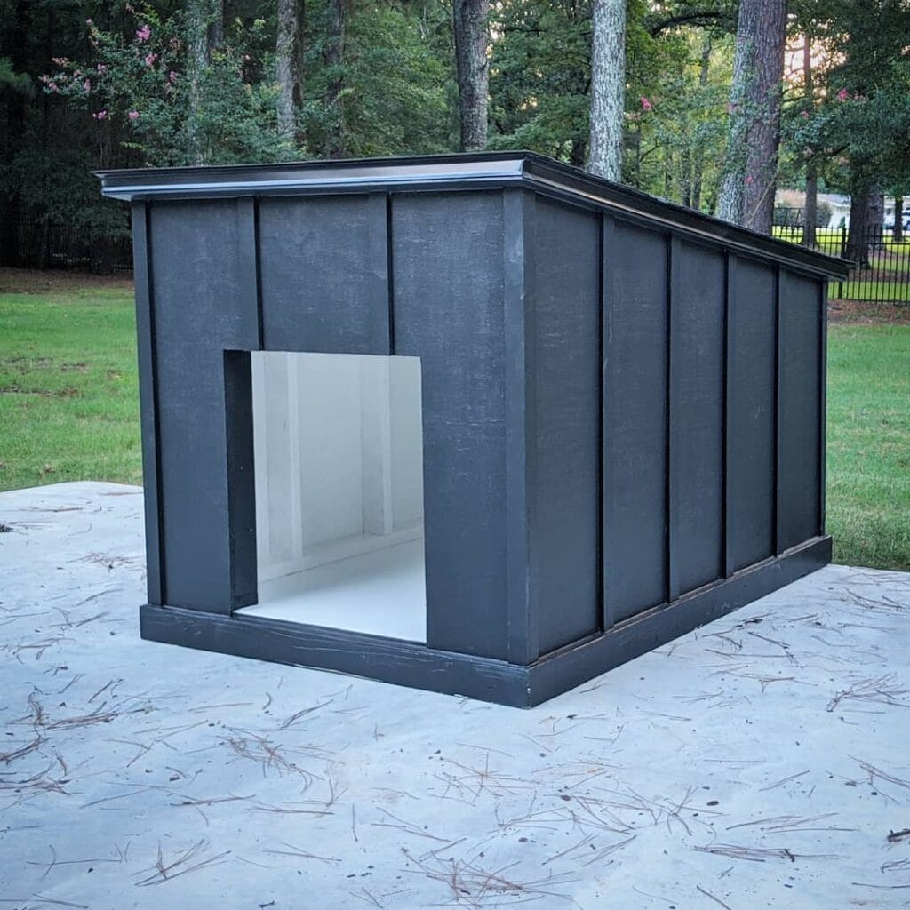 Paint the full exterior in your charcoal color — two solid coats for weather protection. Cut your door opening off-center on the left side like you see here. That placement naturally blocks wind from blowing straight inside, so your dog gets a draft-free retreat she’ll actually use.