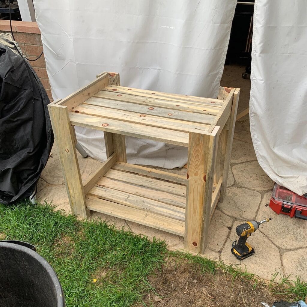 Cut your 2×2 posts to 18 inches tall for the four corner supports. These carry the whole structure, so clamp them tight before driving screws. Don’t rush this part.
