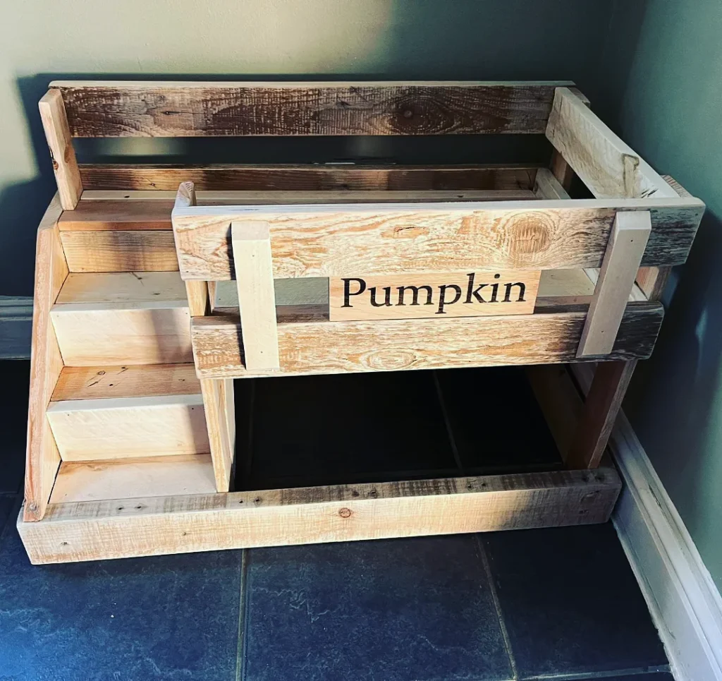 This reclaimed pallet wood dog bunk bed from @atozwoodwrk is the thing I didn’t know I needed until I saw it. It’s rustic, it’s Pinterest-ready, and it has a custom engraved name plaque right on the front — “Pumpkin,” in this case — which honestly makes it feel less like pet furniture and more like a piece your home actually wants.