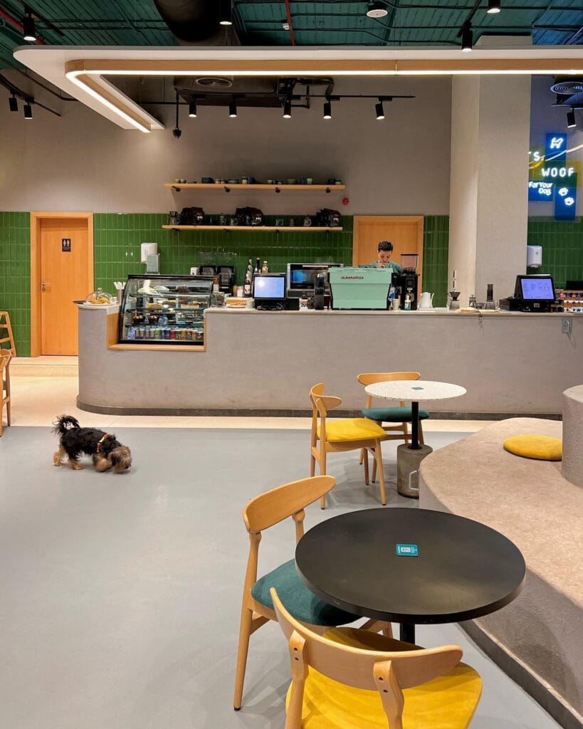 A simple design tip is to keep table spacing slightly wider than in traditional cafes to allow dogs to sit comfortably beside chairs.