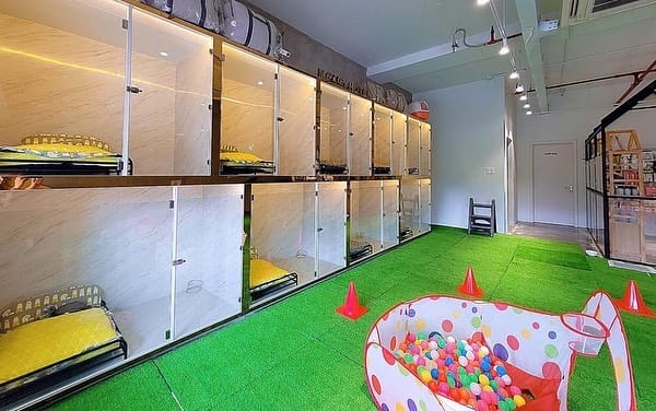 Walking into this dog cafe space feels a bit like stepping into a modern dog hotel. Rows of glass-front dog suites line the wall, each fitted with comfortable beds, while a bright artificial grass floor creates the feel of a mini indoor park.