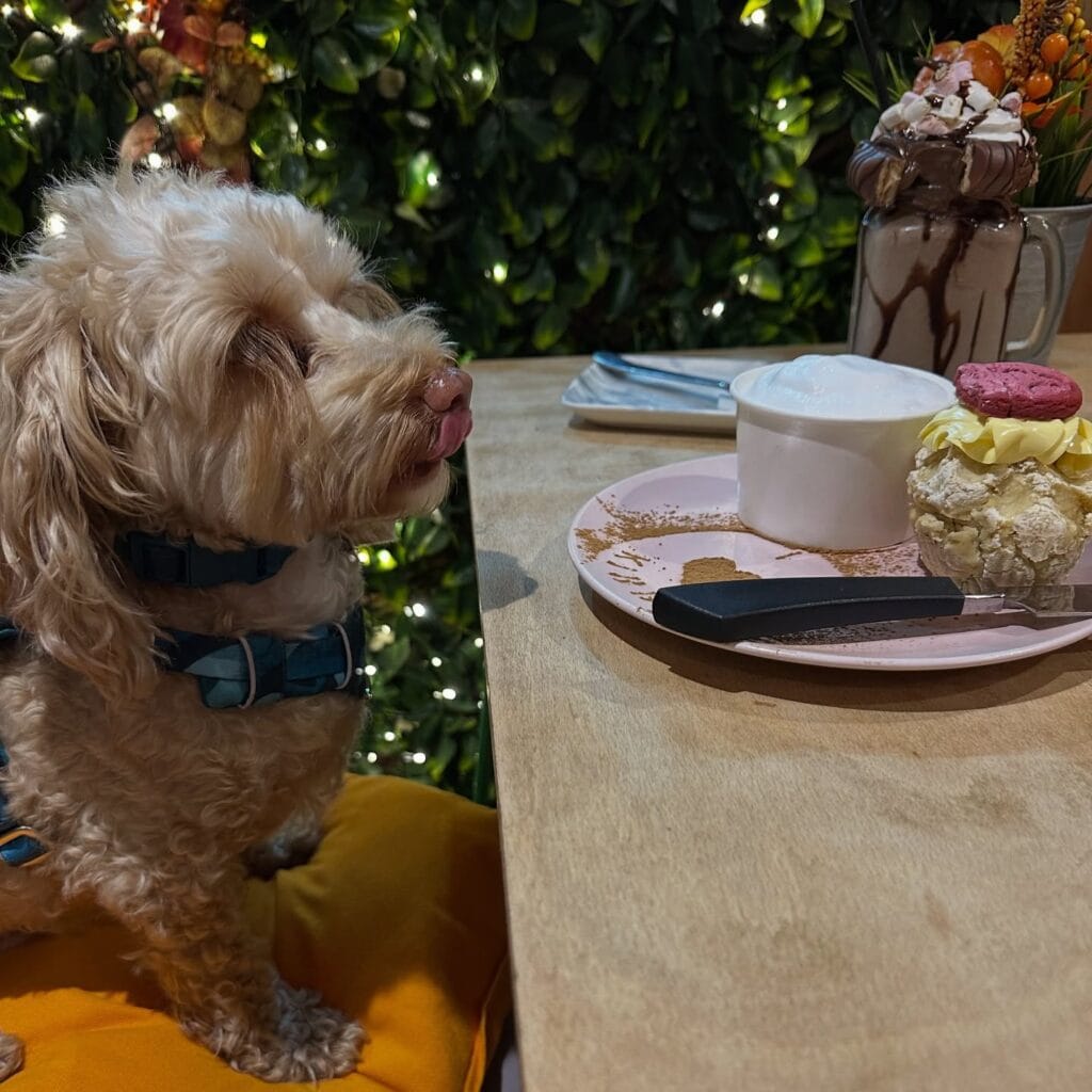 This warm cafe moment captures the charm of dog-friendly dining. A small dog sits beside its owner, gazing curiously at desserts on the table while surrounded by soft lighting and leafy greenery.