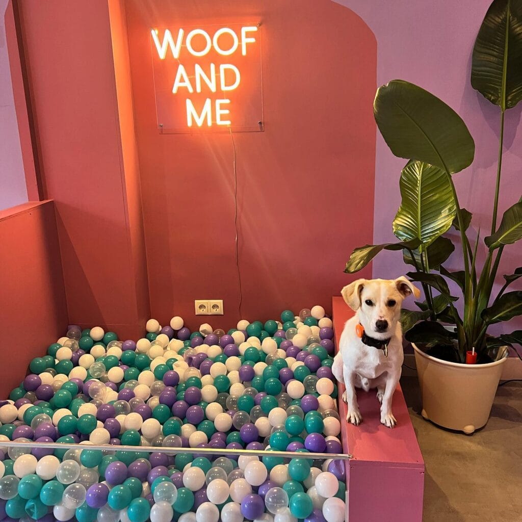 This vibrant corner brings a burst of fun into the cafe. A pastel-colored ball pit sits beneath a glowing neon sign that reads “WOOF AND ME,” creating a perfect photo spot for visitors and their dogs.