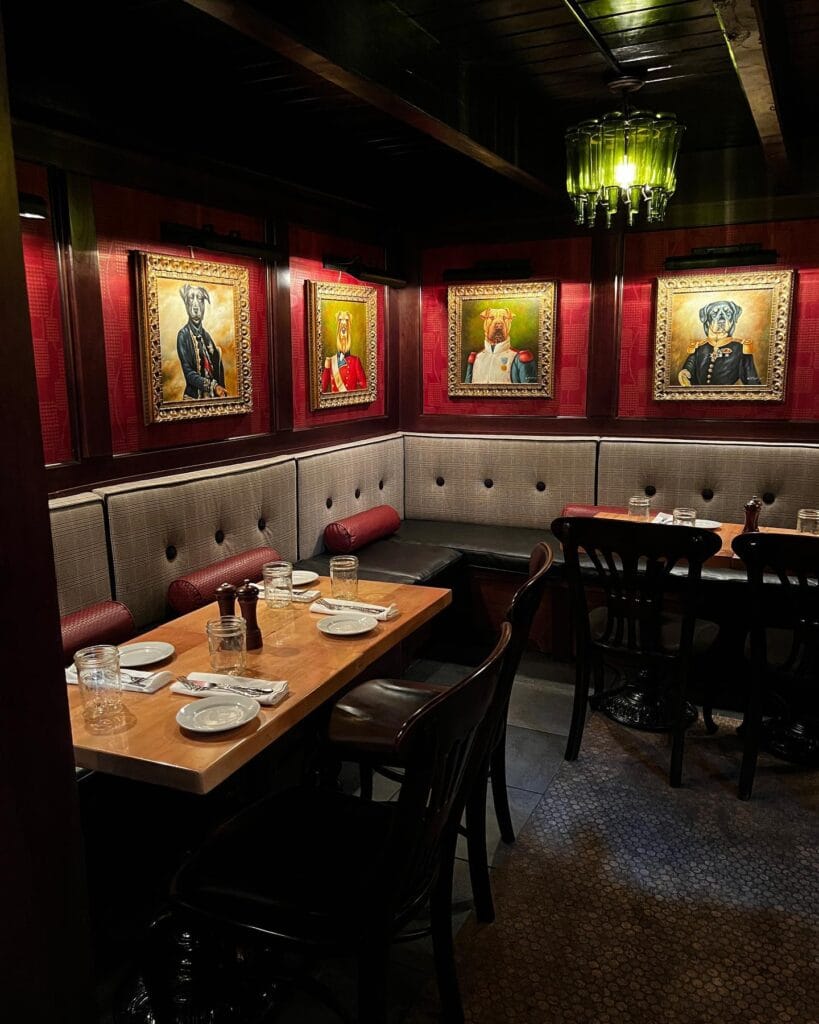 This elegant lounge feels like a stylish restaurant with a playful twist. The walls feature framed portraits of dogs dressed like aristocrats, creating a humorous yet classy atmosphere.