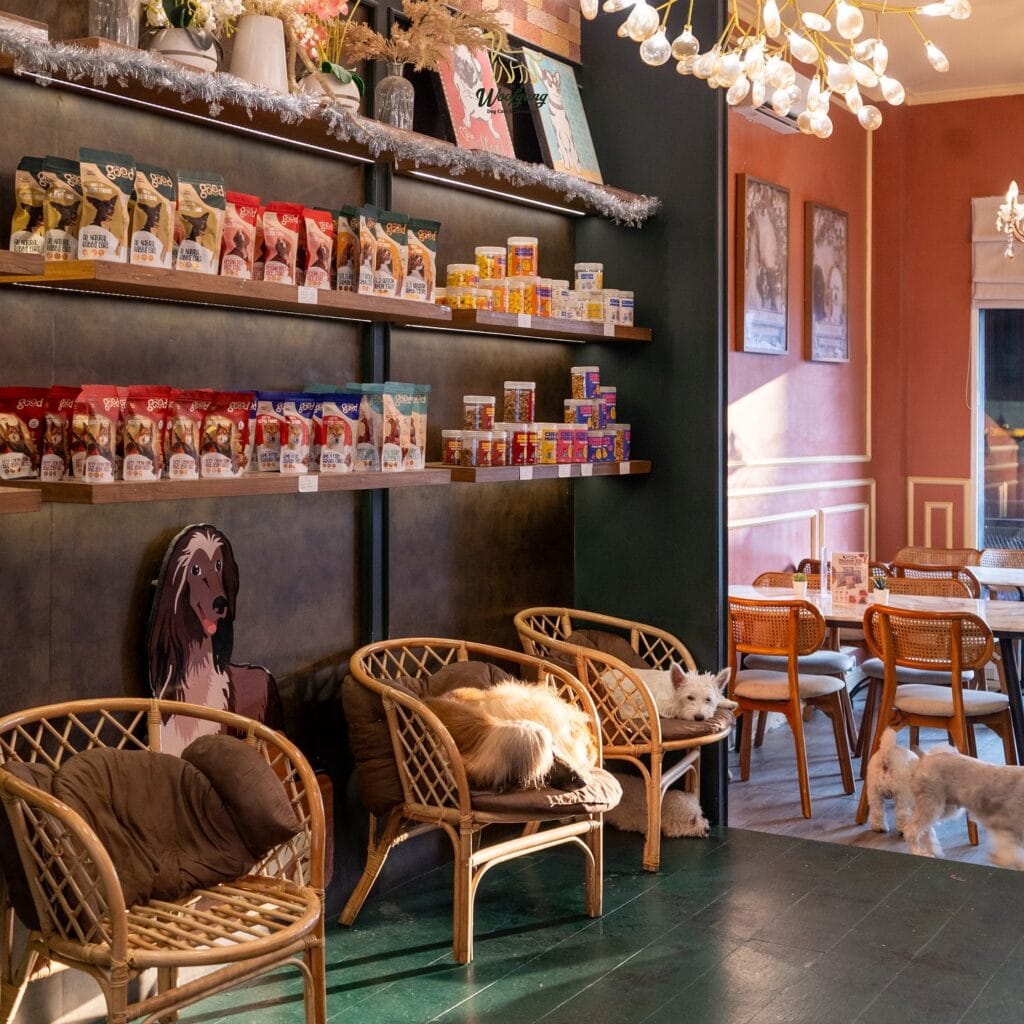 This cafe corner combines a pet boutique with a cozy lounge. Shelves filled with dog treats and accessories sit above comfortable rattan chairs where dogs can relax while their owners browse.
