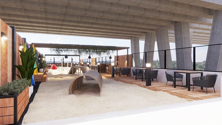 This outdoor rooftop design turns a cafe patio into a playful dog park. The sandy center area allows dogs to dig and explore, while wooden seating decks provide comfortable spots for owners.