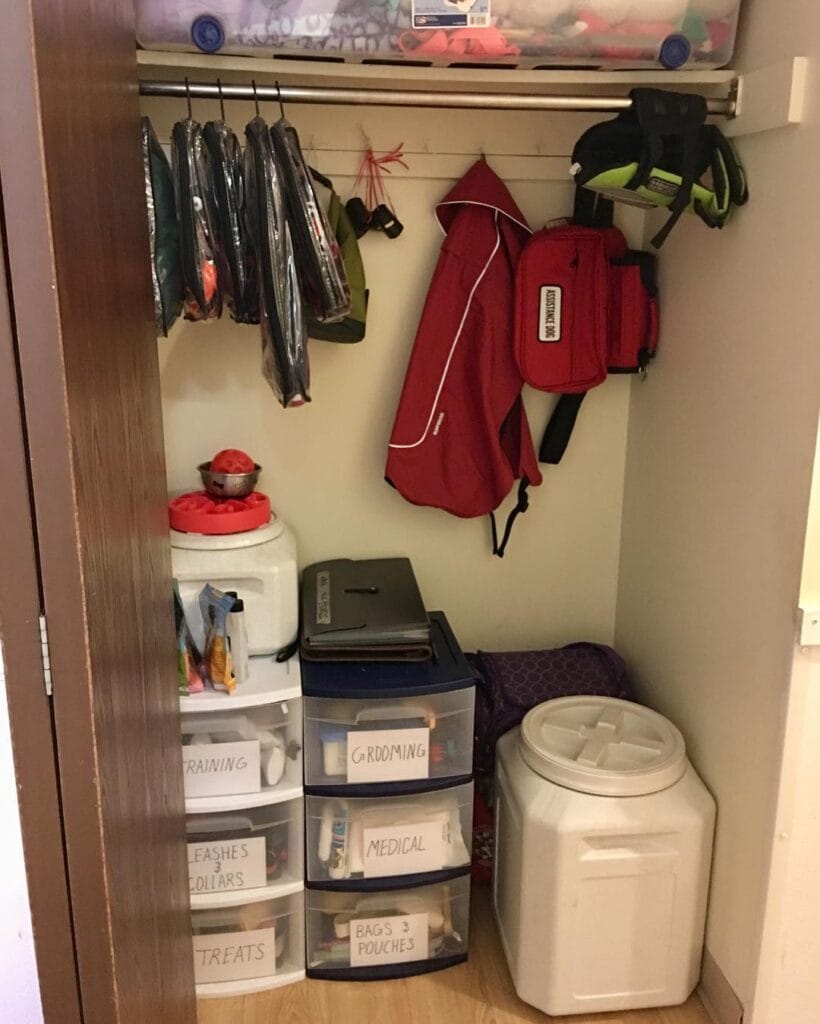 Keep the service dog vest and working gear hanging separately on the far right. It signals to your pup that “work mode” is starting — which honestly helps with focus.