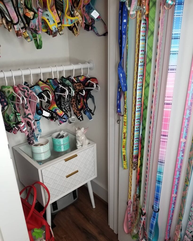 This closet is doing the most — in the best way. We’re talking colorful harnesses hung on white plastic hangers on a tension rod, a full wall of leashes clipped to the door panel, and a white diamond-quilted nightstand acting as a mini vanity. The whole thing has this cute, organized boutique energy.