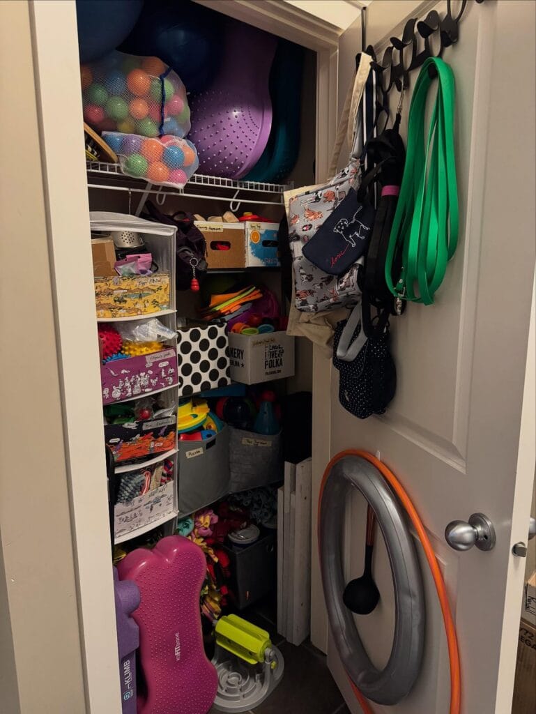 This closet is everything. It’s a dedicated dog supply command center — wire shelving, labeled bins, an over-the-door hook rack holding green resistance-style long lines and multiple leashes, and a purple textured balance disc stored up top with a mesh bag of colored balls.