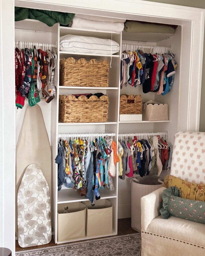 It’s a white wood shelving system with double hanging rods — one at the top, one lower — giving you two full levels of hanging storage. The center column has woven water hyacinth baskets (those scalloped-edge ones from Target or Amazon) sitting on fixed shelves painted in warm white. Neutral fabric cube bins anchor the bottom. An ironing board tucks against the left wall — swap that spot for a dog crate or a folded-up pet bed.