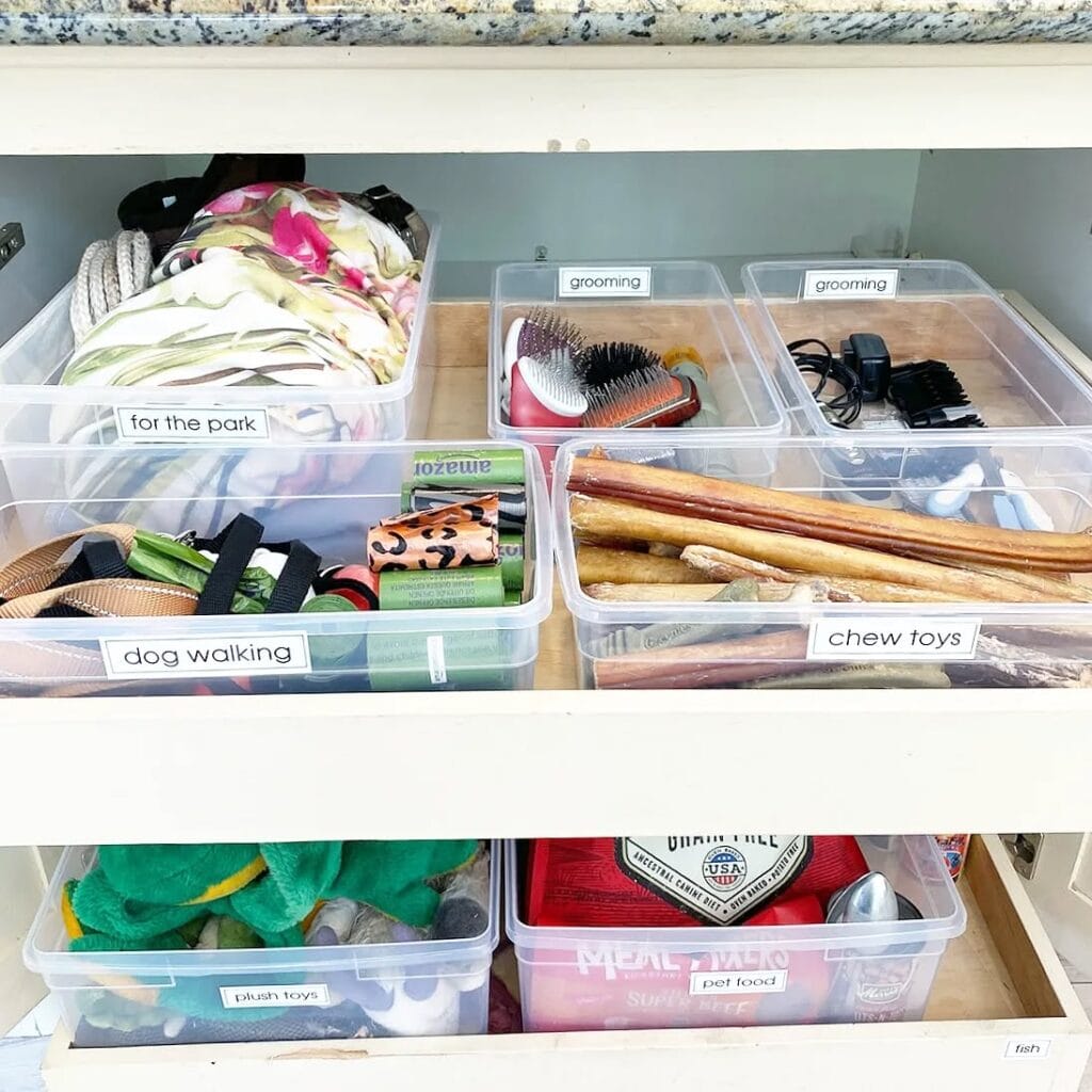Label everything by dog name if you have multiples — those little label holders on drawer units are genuinely a game-changer for a busy household.