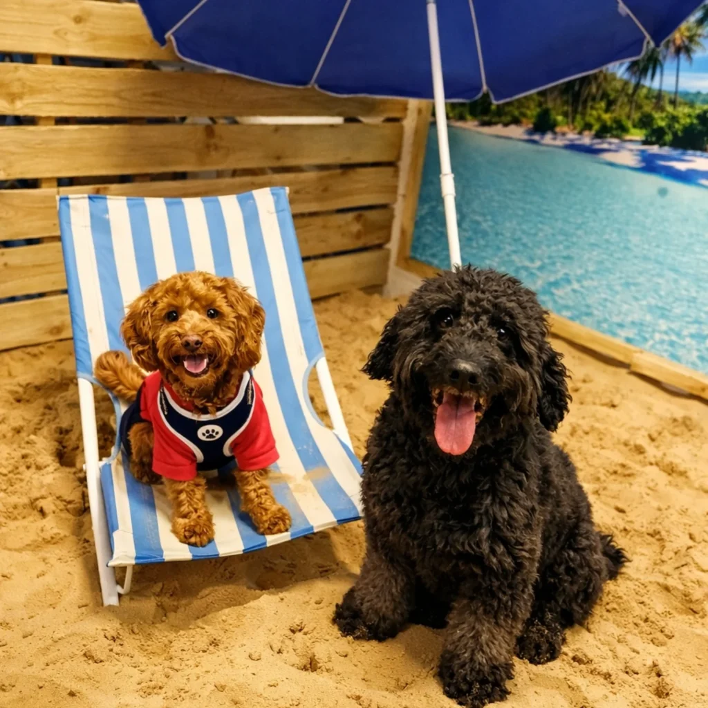 Guests sit on the bench without realizing it’s Biscuit’s throne. She doesn’t mind sharing during parties. Between grooming sessions for her regular dog haircut maintenance, she lounges here contentedly.
