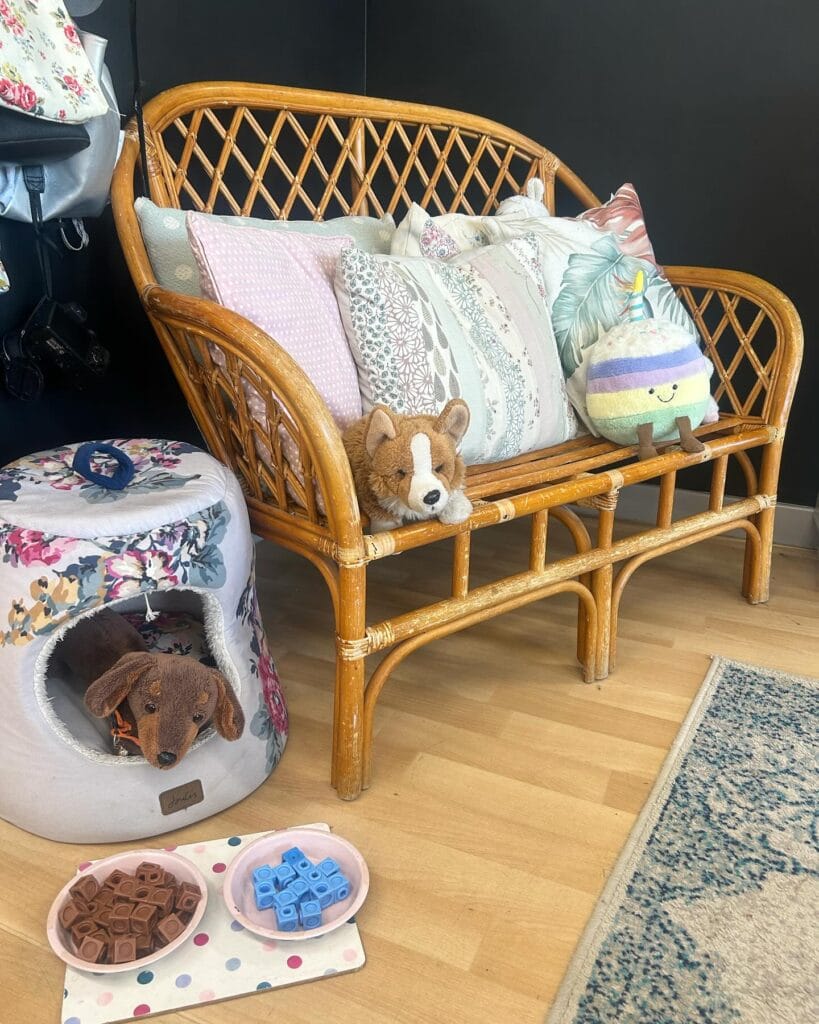 The 3×4 corner setup uses a 36-inch rattan bench against two walls. Five decorative pillows create a soft sleeping surface. A small stuffed corgi toy marks Biscuit’s spot. The bench sits 18 inches high so she hops up easily.