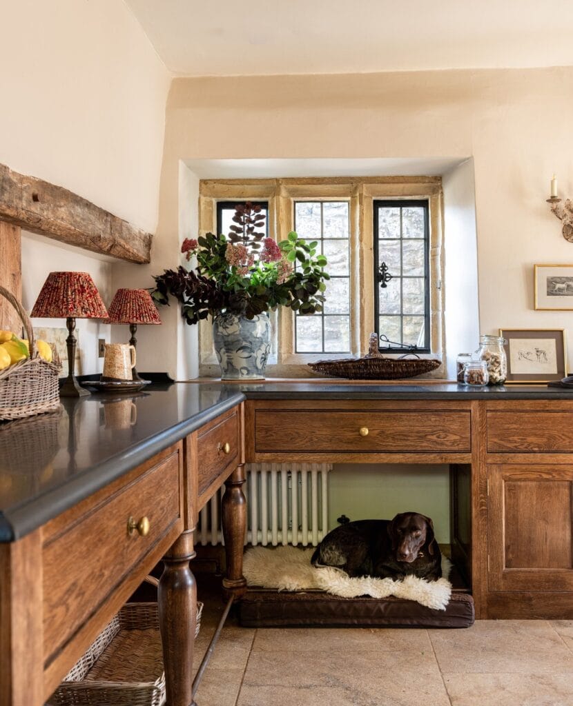 The countertop doubles as staging space for dog bowls, plants, and decorative baskets. Dark gray soapstone handles spills from water bowls without staining. Everything wipes clean in 30 seconds after meals. Your kitchen looks intentionally designed, not pet-overtaken—guests assume it’s built-in furniture until your dog crawls out. For more creative ways to integrate pets into home design, check out these dog animation ideas that show how thoughtful details transform spaces.