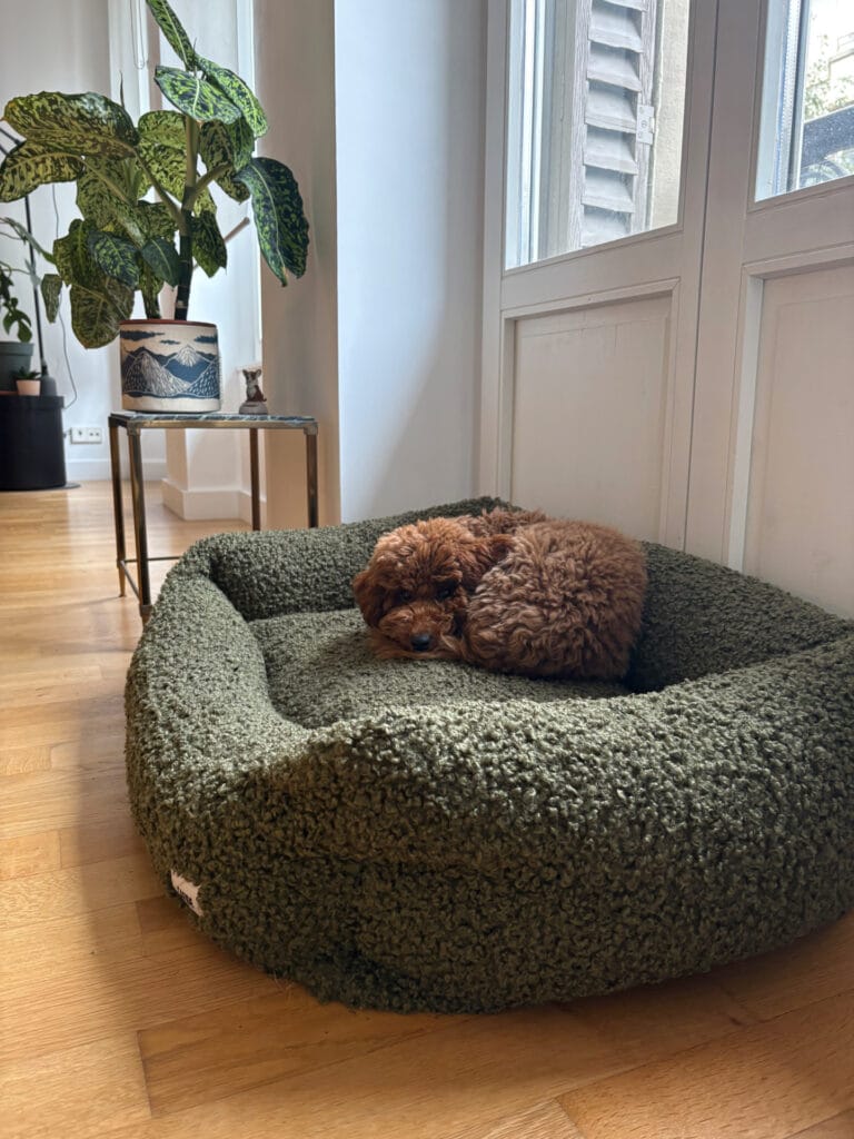 It fits beside your existing furniture without blocking walkways. Dogs enter from the hallway, settle in their corner, and stay out of guest traffic flow. The neutral olive-green tones blend with most dog custom ideas while looking intentional, not cluttered. You can adapt similar DIY dog bed ideas to match your room’s style perfectly.