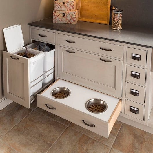 This pull-out feeding drawer tucks into a 24-inch cabinet space. Two stainless steel bowls sit in cutout holes that hold them steady. A slim bin beside the bowls stores 10 pounds of kibble. The whole setup slides out when your dog eats, then disappears when you close it.