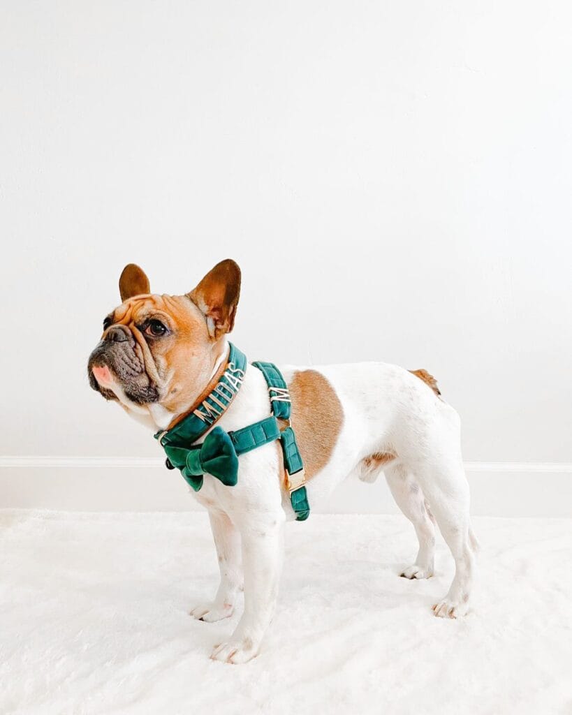 The star here is a deep hunter green velvet harness paired with a matching personalized name collar — this one reads “MIDAS” in gold lettering. The velvet bow tie attached at the chest pulls the whole look together. It’s structured, elegant, and fits snug without looking stiff.