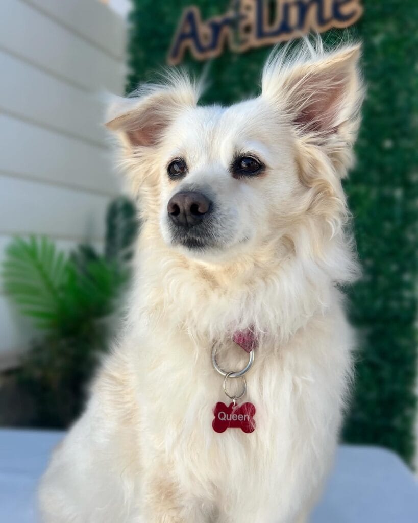 This cream-coated sweetheart is rocking a bone-shaped, red acrylic tag engraved with “Queen” in clean white lettering. It clips onto a pink fabric collar using a double-ring silver clasp — simple, secure, and honestly adorable against all that fluffy white fur.