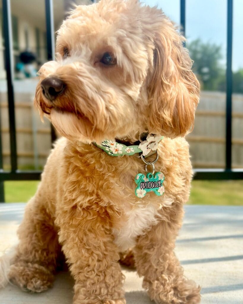 To recreate this, grab a custom printed fabric collar (search Etsy for “floral dog collar mint”) and order a matching personalized resin tag with your dog’s name in a bold script font. Lots of small shops will match the tag design to your collar if you message them. And honestly? The color coordination is what makes it chef’s kiss.