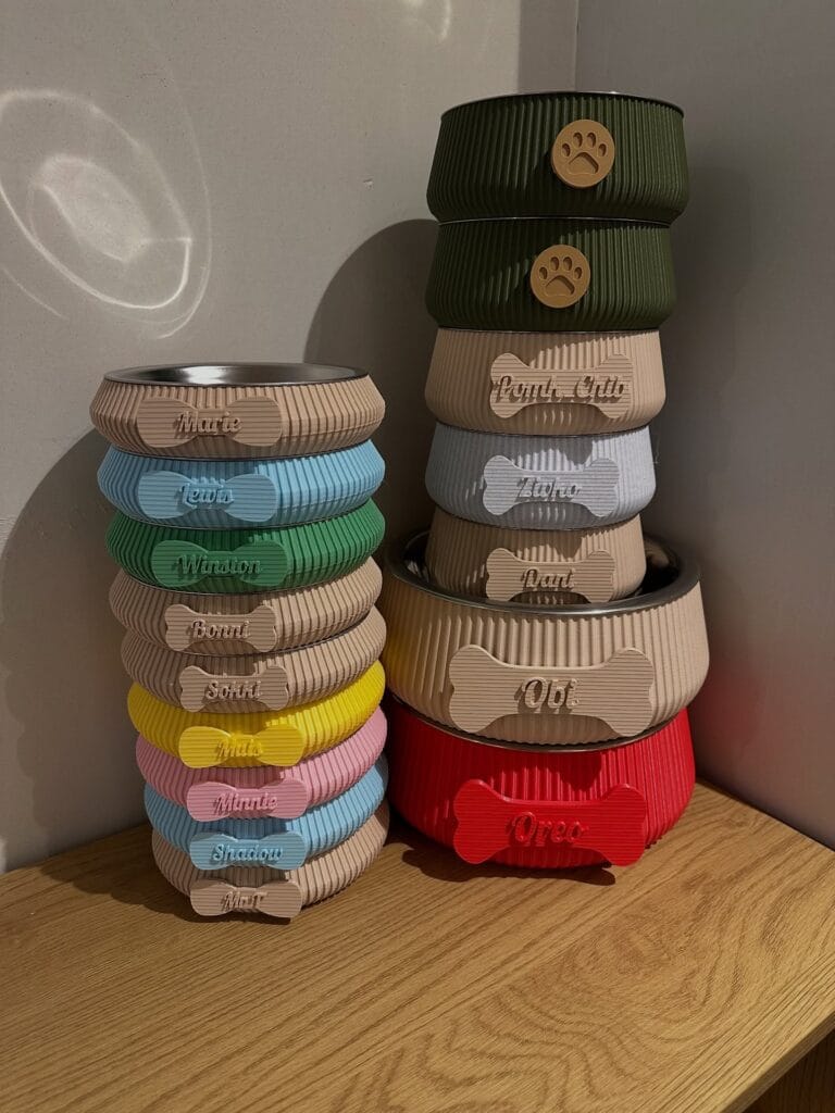 These 3D-printed custom dog bowls are everything. Each one has a ribbed outer shell in colors like forest green, sky blue, cherry red, blush pink, and warm taupe — with a bone-shaped name tag molded right into the front. The inner bowl is stainless steel, so it’s actually easy to clean and hygienic.