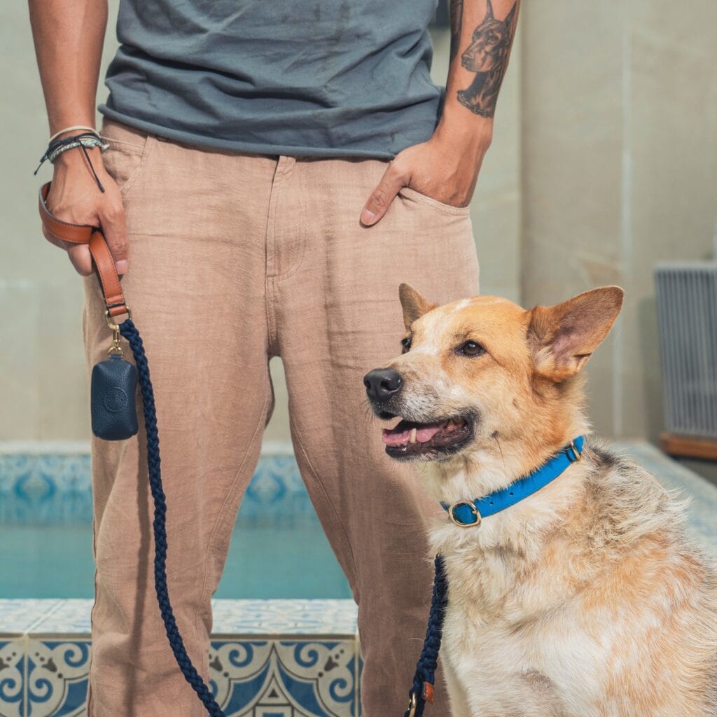 To get this exact look, you need a macramé-style braided rope leash in navy, a full-grain leather collar in royal blue, and antique brass D-ring and buckle hardware. The bag dispenser clips to the leash with a carabiner — keeps everything in one hand.