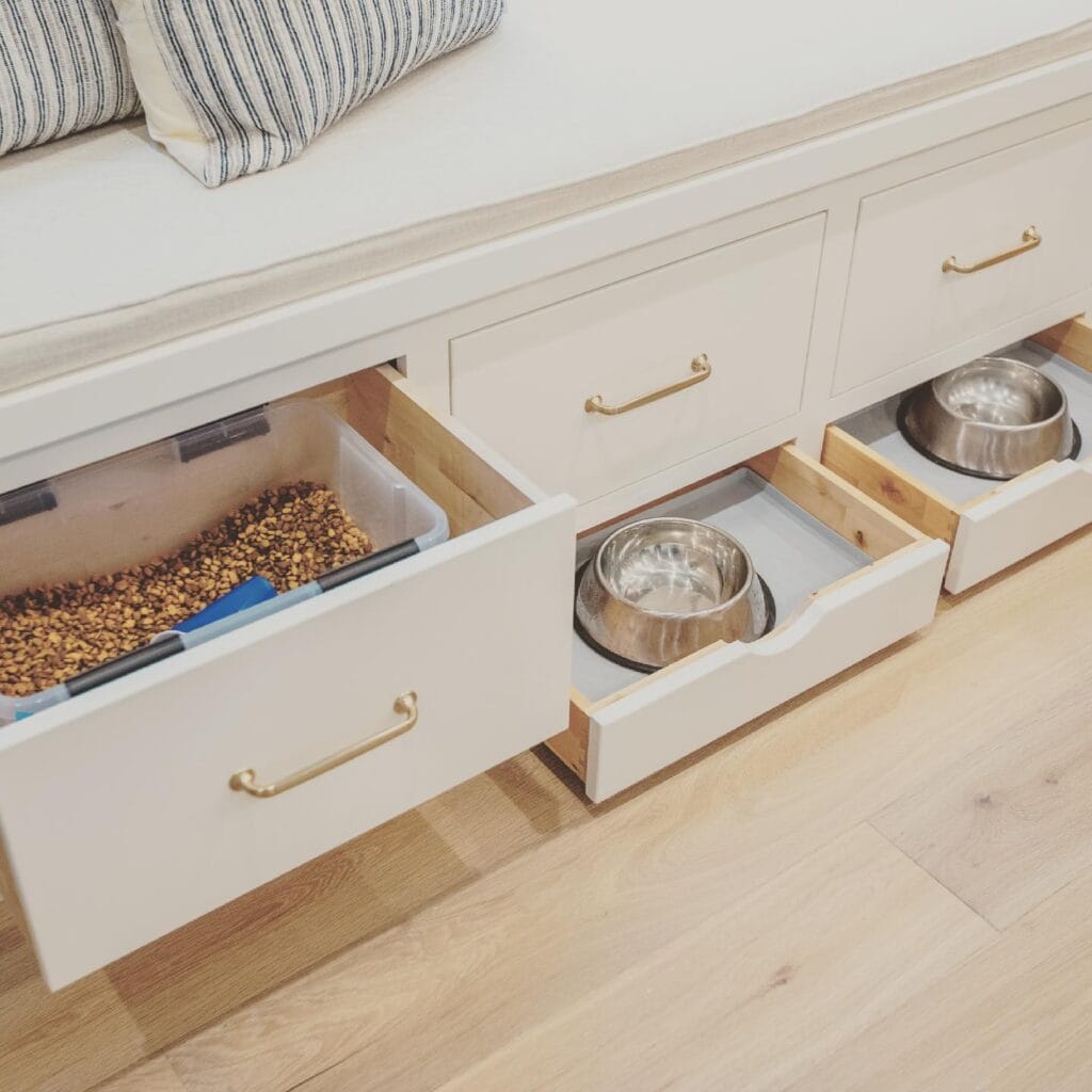 Build three pull-out drawers under a bench seat cushion. The left drawer — the widest one — fits your plastic kibble bin plus a blue scoop inside. The two right drawers each cradle one stainless steel bowl, sitting inside pine wood dividers so they don’t slide around.