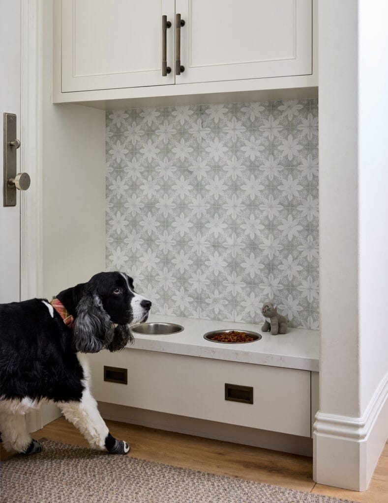 #6: Built-In Dog Feeding Station with Tiled Backsplash and Storage Drawers