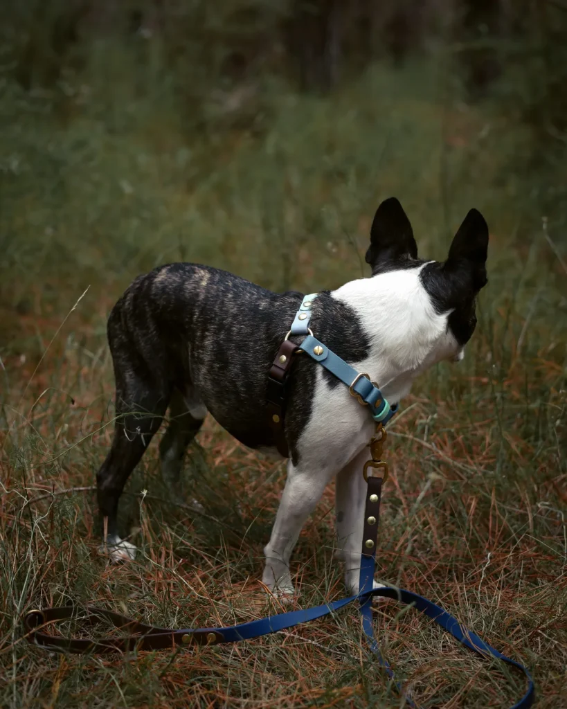 This harness setup is giving serious outdoorsy-chic energy. We’ve got a steel blue leather chest strap paired with a dark brown leather back strap, held together with brass gold hardware — and honestly? The contrast against a brindle-and-white coat is chef’s kiss. The blue leash trailing through the pine needles just ties the whole look together.