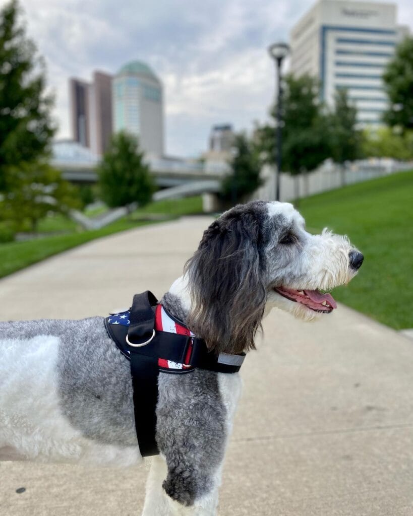 This harness is giving full Americana energy. The American flag print pops against a black base, with distressed red, white, and blue detailing that feels bold without being over the top. It sits on what looks like a doodle mix, and honestly? The fit looks chef’s kiss — snug but not restrictive around the chest.