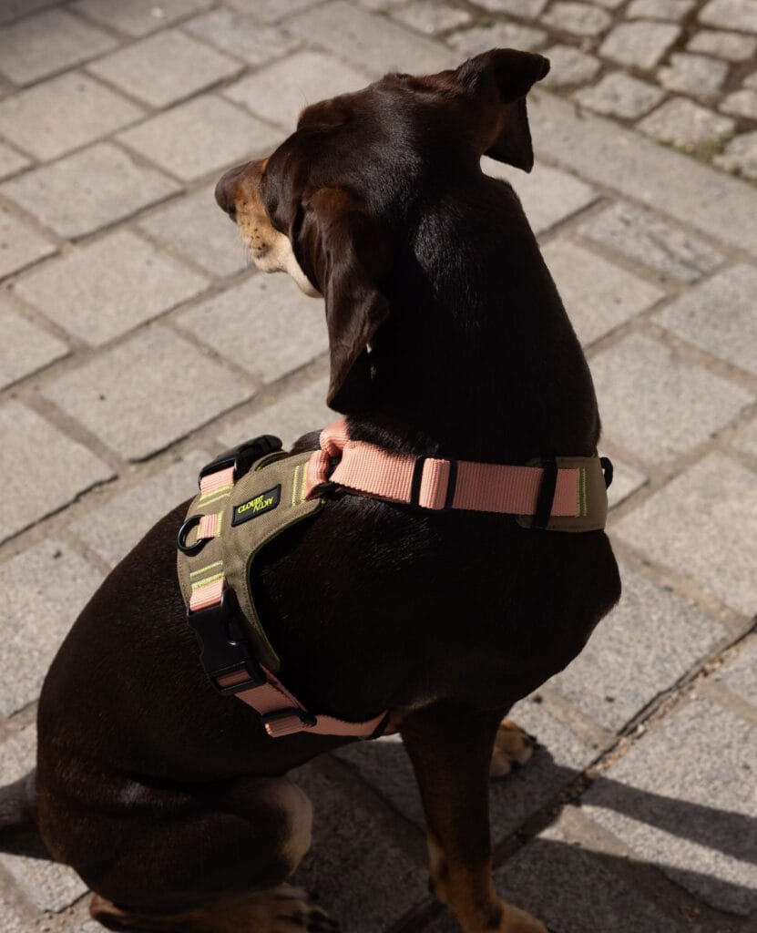 This harness pattern is giving me everything. The olive green canvas body panel sits flat against the dog’s chest and back, paired with dusty rose nylon webbing straps that wrap around the neck and belly. It’s structured but not bulky — and honestly it looks so good on a dark-coated dog.