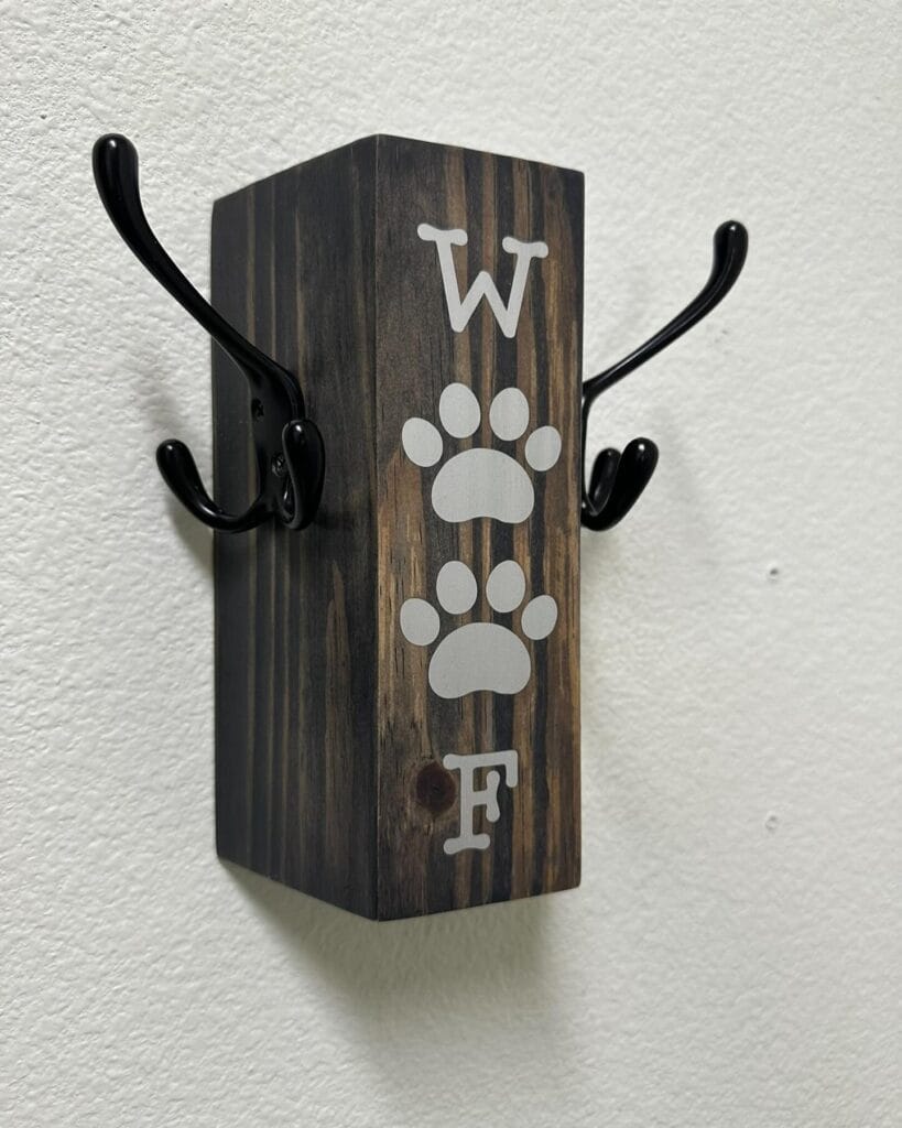 #8: DIY “WOOF” Paw Print Leash Holder With Black Metal Hooks