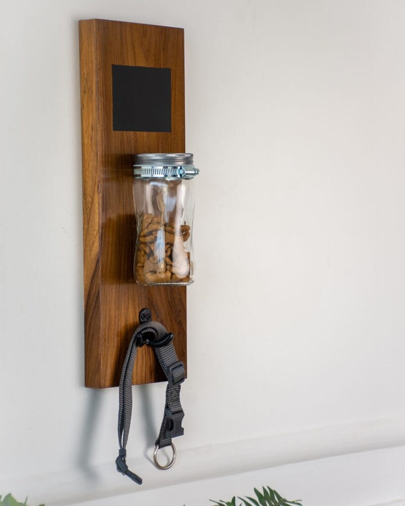 The chalkboard label keeps scheduling visible, the jar keeps treats within reach, and your leash stops living on the floor — that’s the feature-benefit-payoff that makes this worth building on a Sunday afternoon.