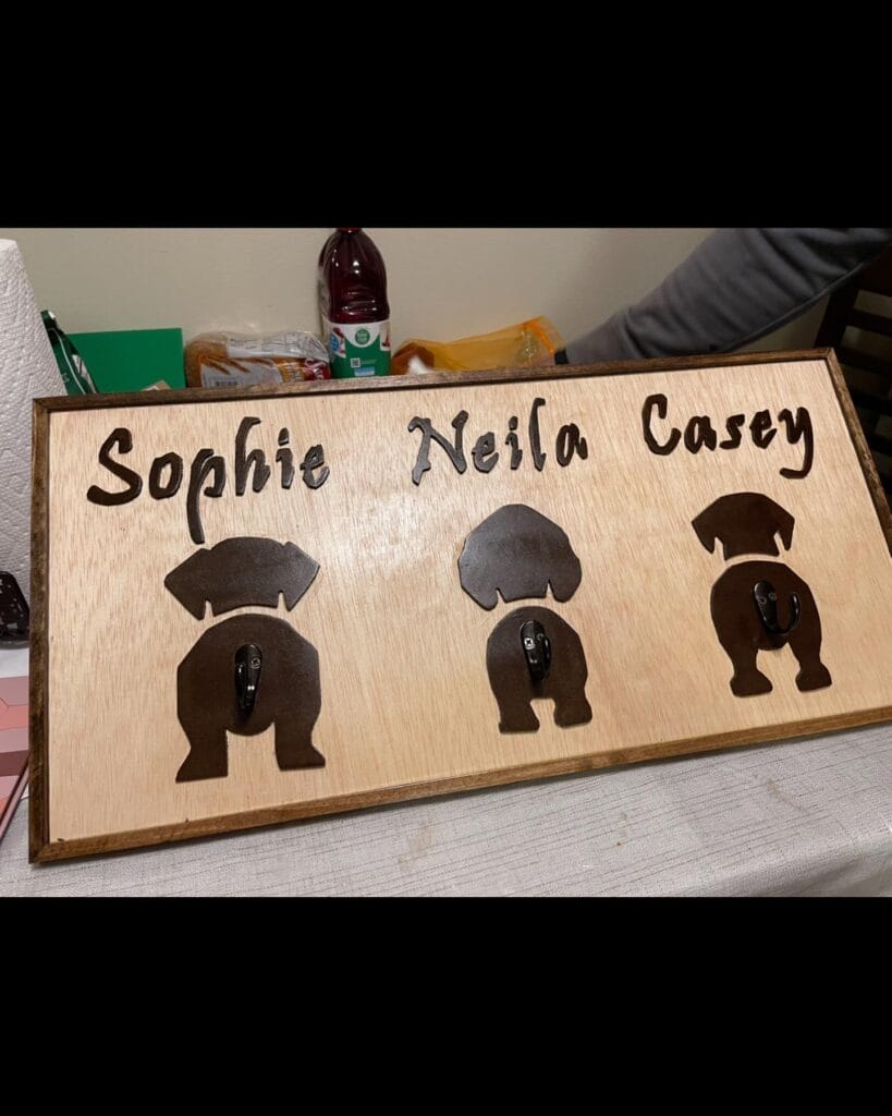 The one in this photo features three dog silhouettes carved from light birch plywood with a dark walnut stain border. Each dog’s backside — and yes, it’s showing their little butts, which I love — has a black metal hook mounted right underneath. The names Sophie, Neila, and Casey are burned above each pup in a handwritten-style font.