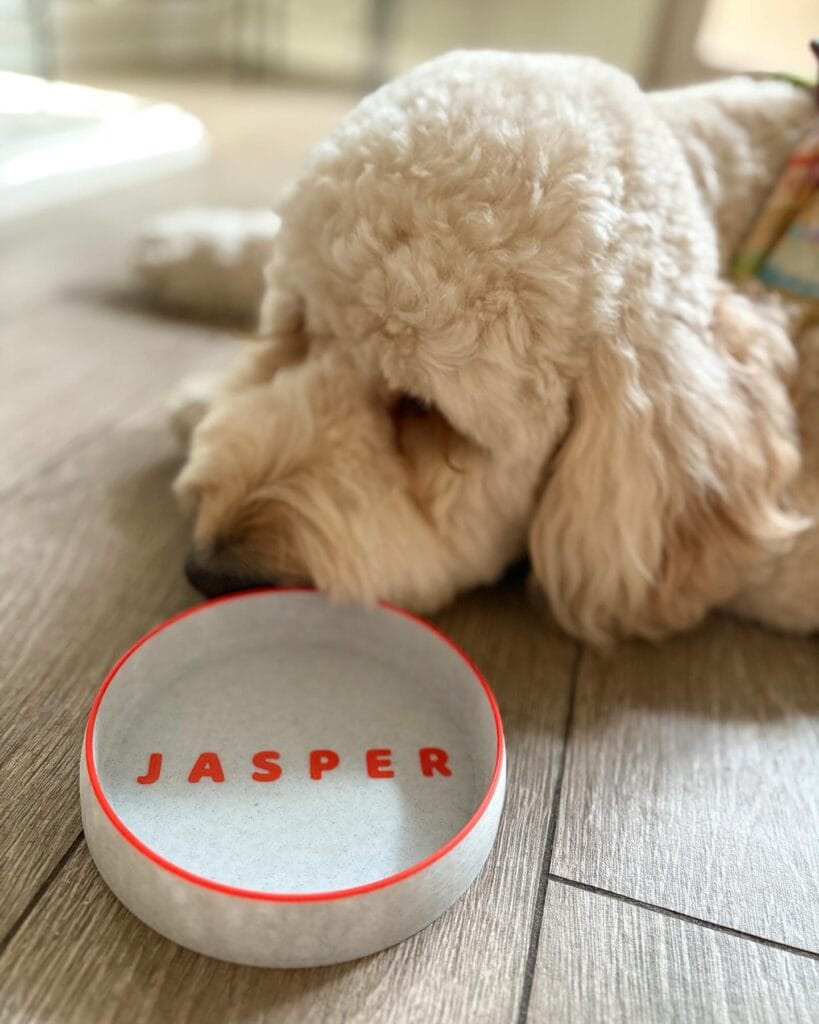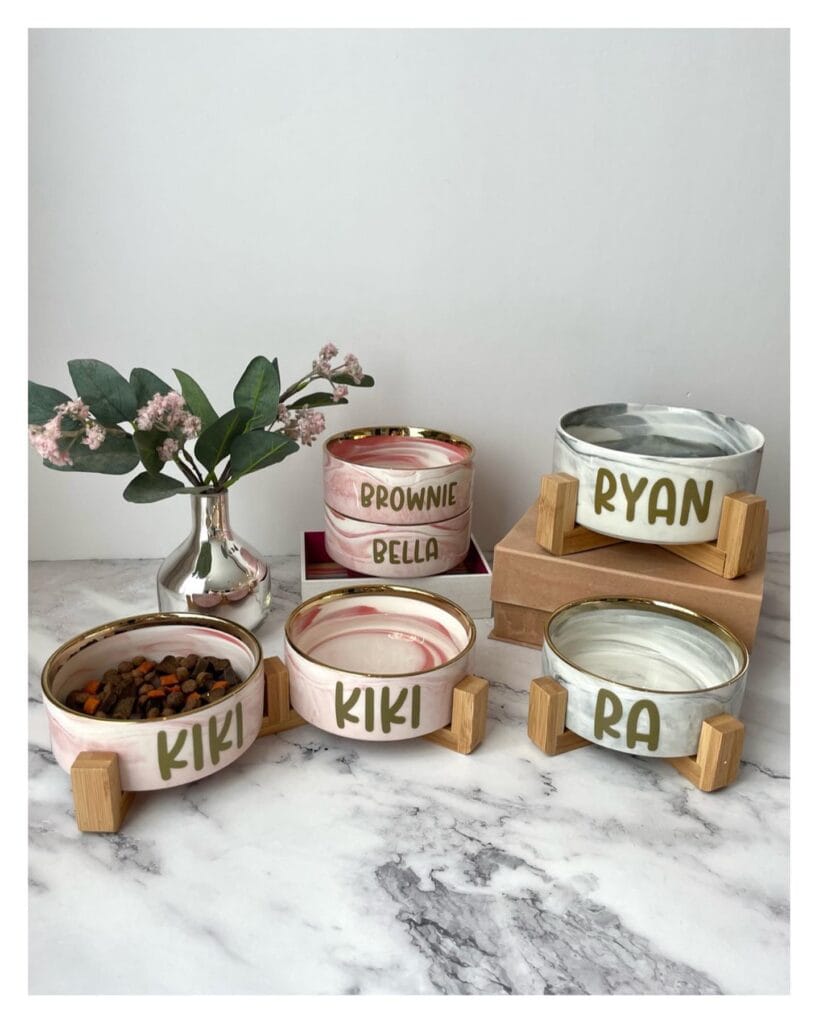 The name on the bowl is what gets me. “KIKI,” “RYAN,” “BELLA” — written in that chunky olive-green font. My cousin got one made for her lab and I literally almost cried when I saw it on her kitchen floor. It looked like actual home decor.