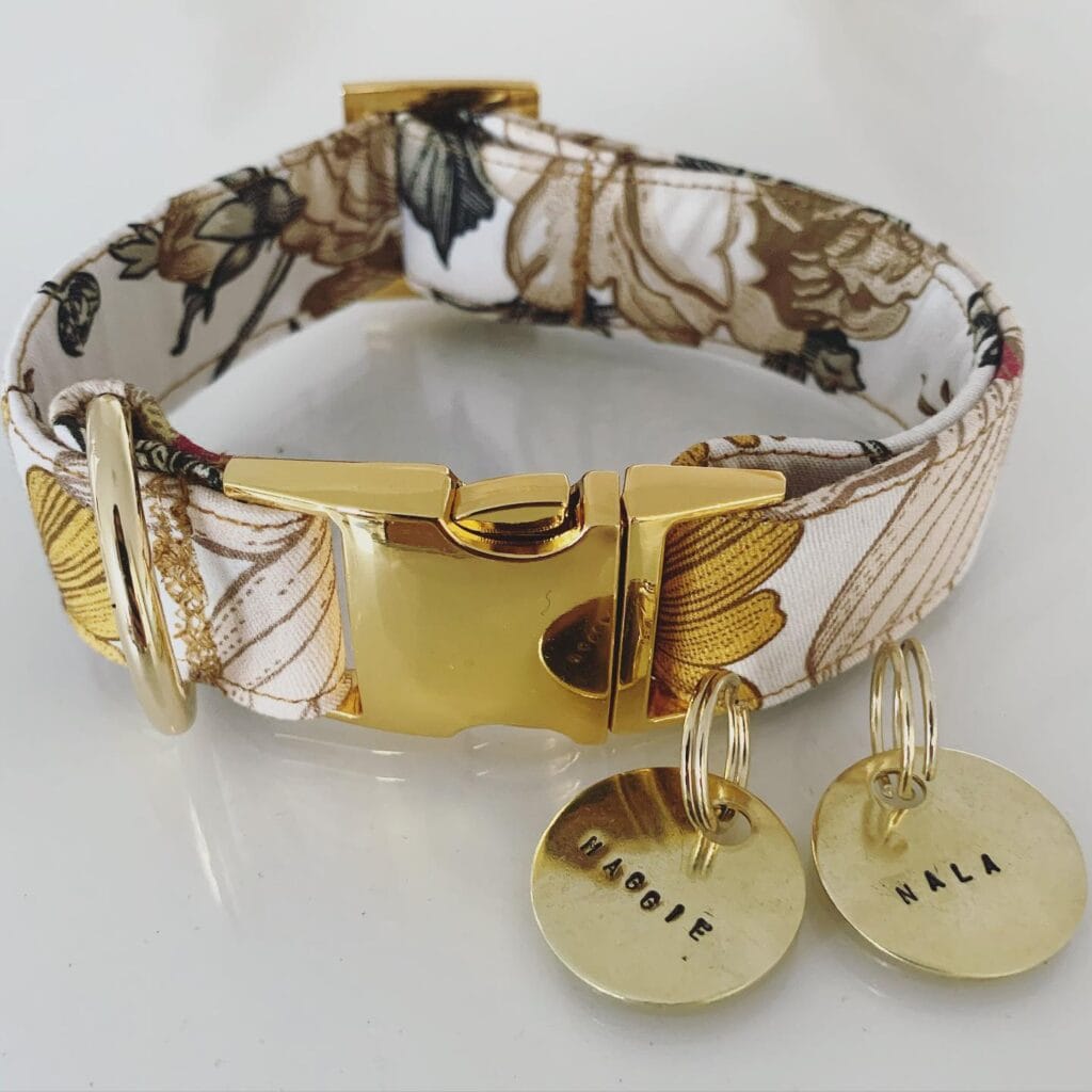 The white floral fabric is printed with golden botanicals and secured with a gold-tone metal buckle that looks more jewelry than pet store. Two hand-stamped brass ID tags hang from the D-ring — one reads “MAGGIE,” one reads “NALA.” So cute it almost hurts.