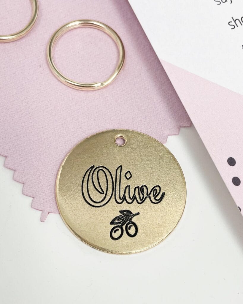 This brass-toned circular pet ID tag is engraved with the name “Olive” in a flowing script font, paired with a hand-drawn olive branch illustration underneath. It comes with a split ring attachment and sits around 1.25 inches in diameter — small enough not to weigh down her collar, big enough to read at a glance.