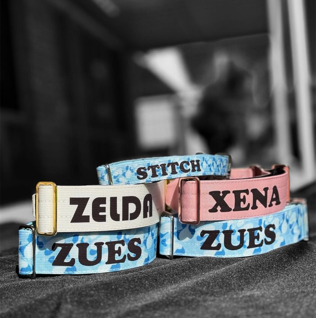 To recreate this look, order a custom name collar from a shop like Wulfzco. Pick a print that matches your dog’s personality — the tie-dye screams fun, the pink feels sweet, the cream looks clean and classic.