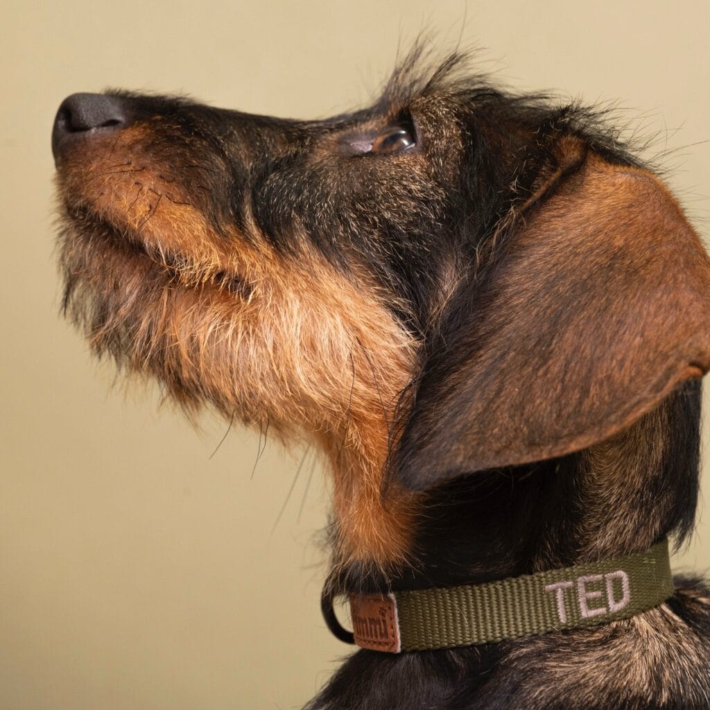 Your golden’s collar is probably a basic red nylon thing you grabbed at checkout. And honestly? Same. But then I saw Ted here — this wire-haired dachshund with his olive green, embroidered name collar — and I genuinely stopped scrolling.