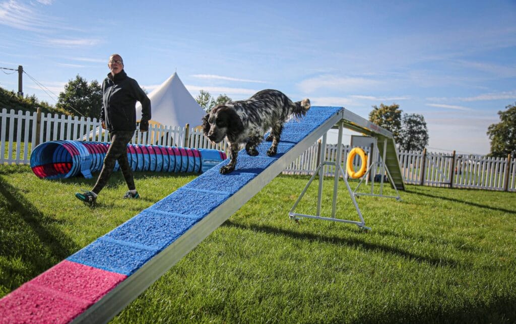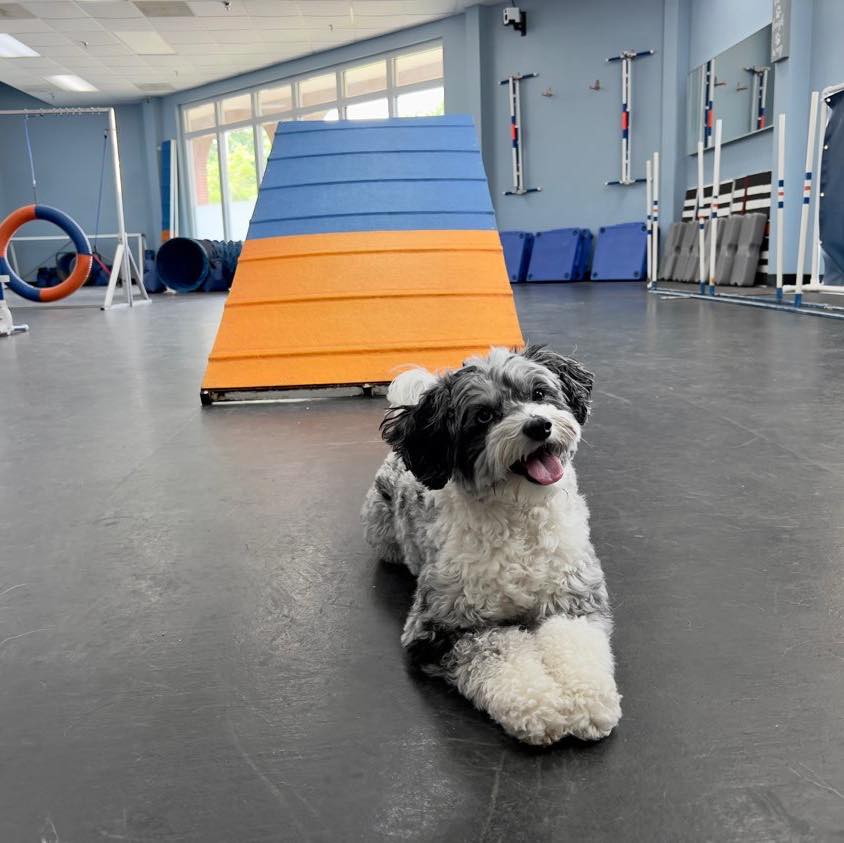 This indoor agility setup is giving full professional dog gym, and honestly, I’m a little obsessed. The blue and orange A-frame ramp is the star of the room — it’s bold, it’s sturdy, and dogs genuinely cannot resist a ramp they can conquer. The whole space feels open and purposeful, with dark rubber flooring that gives paws real grip instead of that scary slip-and-slide moment.