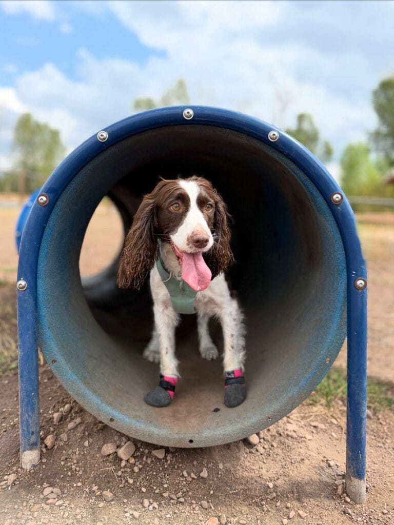 This setup uses a blue PVC rigid pipe tunnel, roughly 24 inches in diameter, mounted on two metal support legs bolted into the ground. The tunnel sits low enough that a medium-to-large dog can move through without crouching. That chocolate-and-white springer is even wearing Ruffwear Grip Trex boots in pink and a sage green dog vest — which tells you this course is built for real outdoor terrain, not just backyard grass.