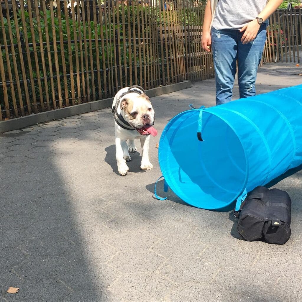 Grab a pop-up agility tunnel in a high-visibility color (the blue here is chef’s kiss for spotting your pup mid-run). You’ll also need heavy-duty sandbags — these keep the tunnel from shifting mid-sprint. The dog in this photo rocks a gray padded harness, which matters because you want control without throat pressure during fast movement.